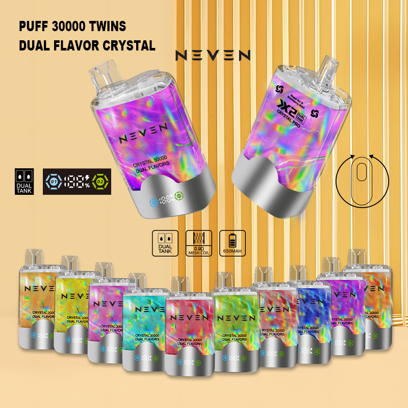 NEVEN X2 TWINS PUFF 30000 CRYSTAL elevates the luxury vaping experience with its innovative design. This stylish device features dual eliquid tanks and a rotating mouthpiece for seamless flavor transitions, allowing you to enjoy two different flavors. With a 30ml eliquid capacity and an impressive up to 30000 puffs, this disposable vape combines durability and sophistication. Its crystal clear housing is embellished with a stunning laser effect marble pattern and a sleek chrome base, exuding elegance.The vibrant LED display keeps you updated on battery life and eliquid levels. It is powered by a 650mAh rechargeable battery and supports USB-C charging for ultimate convenience. The 0.9 ohm meshcoil ensures smooth smoke and rich flavors. Choose from 10 eye-catching colors and 10 carefully curated flavor combinations – a combination of perfection andpersonal expression.